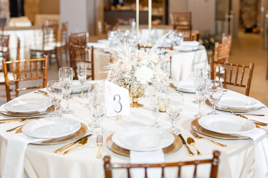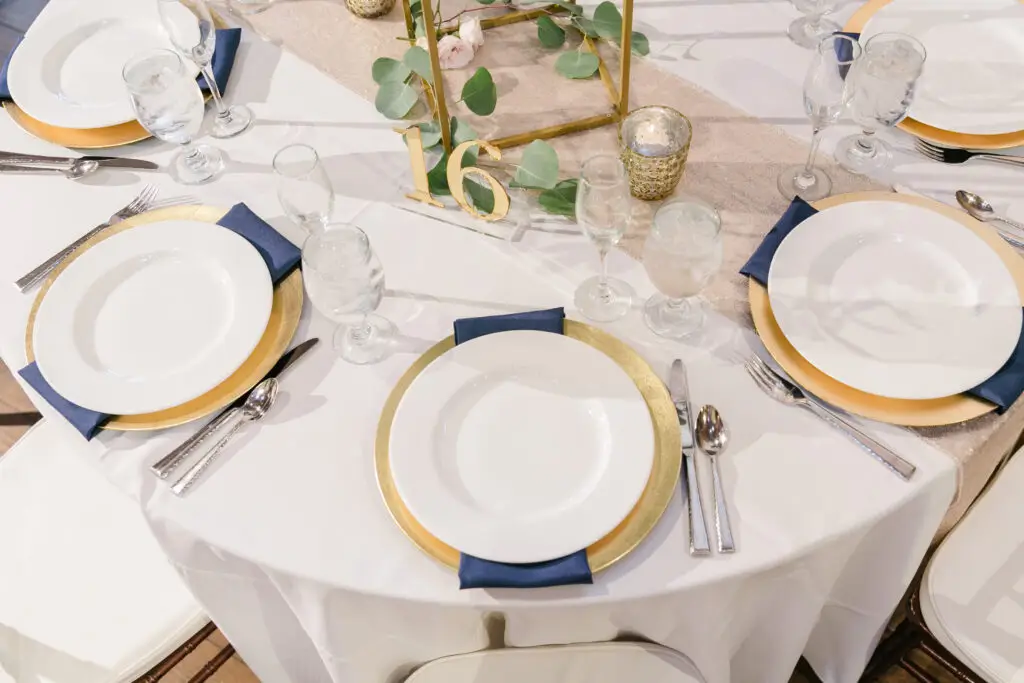 Ivory polyester tablecloth, runner, sash, and dinner napkin.